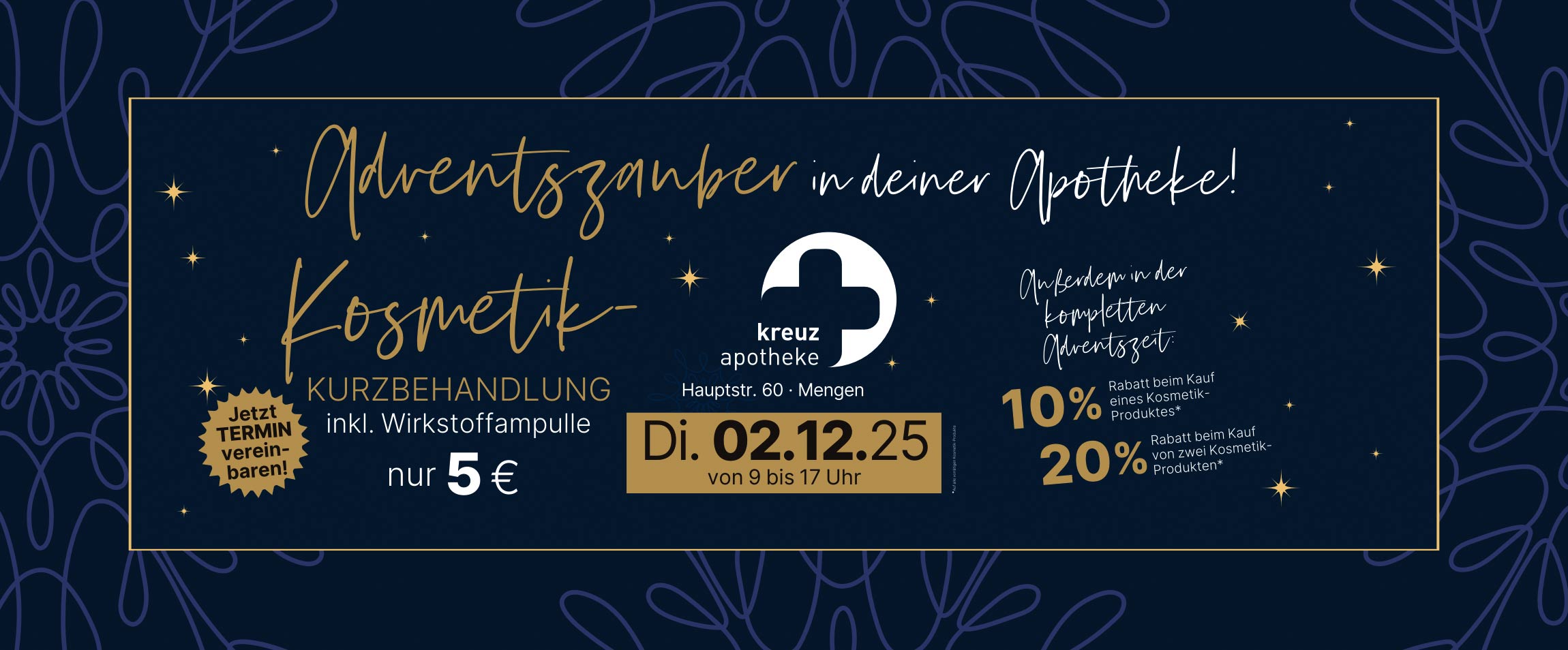 Am Dienstag, 2. Dezember 2025, lädt die Kreuz Apotheke zwischen 9 und 17 Uhr zu einer besonderen Adventsaktion ein. Kundinnen und Kunden können an diesem Tag eine Kosmetik-Kurzbehandlung inklusive einer hochwertigen Wirkstoffampulle zum Preis von 5 Euro erhalten. JETZT einen Termin vereinbaren.